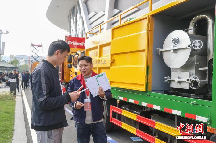 图为室外大型设备展区,客商在与参展商交流。中新社记者 刘力鑫 摄