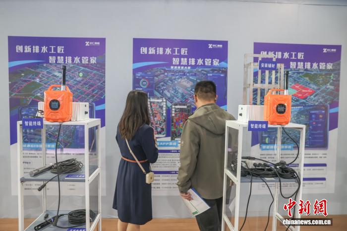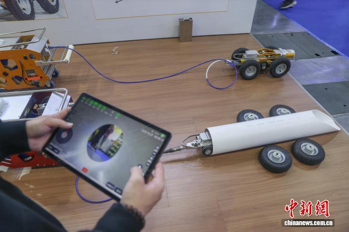 图为瑞昌本地参展商工作人员在平板上操作管道探测机器人进入管道内。中新社记者 刘力鑫 摄